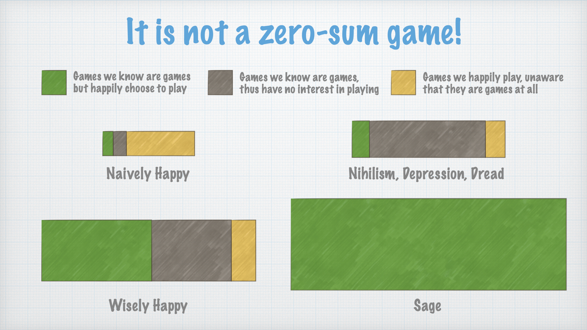 Note that the figure above illustrates only the relative proportions of games across four different stages. What it does not depict is the absolute sizes. When you see much of your existing life turn grey, you may feel an impulse to reclaim the 'yellow' or the 'green'. But the solution does not lie in converting what has become an uninteresting game back into an interesting one, let alone into an unconscious one. That move feels backwards.
